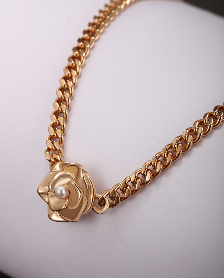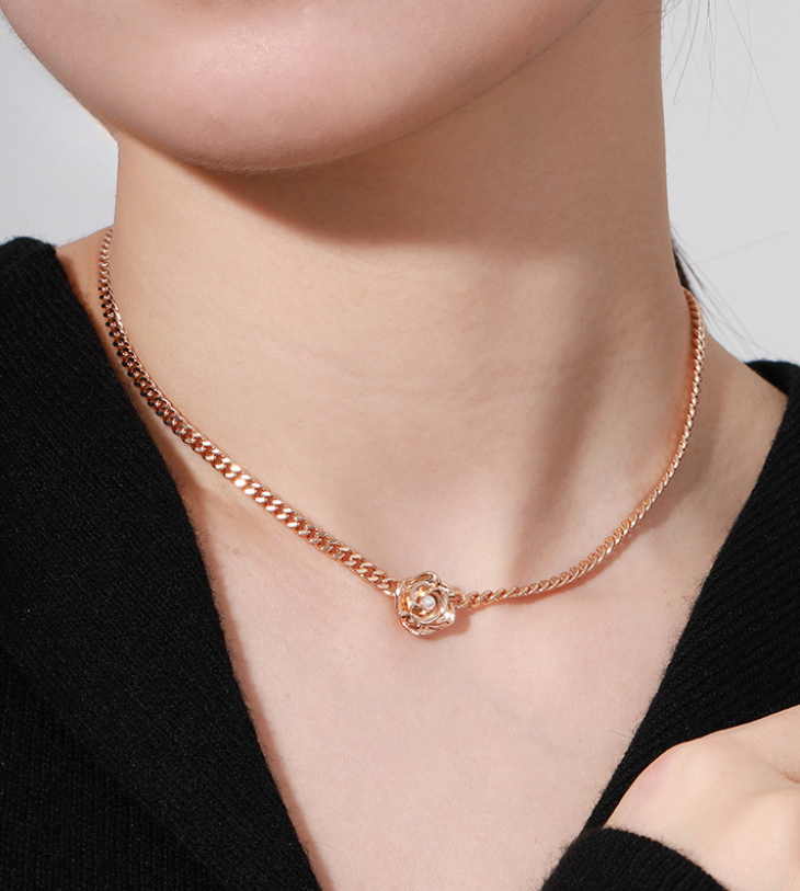 The Camélia Cuban Chain Necklace blends classic structure with soft femininity through a refined camellia-inspired design. Featuring a bold Cuban chain paired with a delicate camellia motif, this necklace creates a unique contrast between strength and elegance.