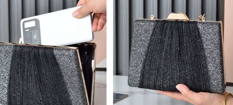 These captivating box clutches combine a rich, shimmering glitter body with an elegant central drape of matching fabric, creating a sophisticated texture contrast. Each bag features a sleek metallic top handle and a discreet golden clasp, blending modern design with timeless glamour. Perfect for evening events, these bags add a refined sparkle and an artistic touch to any formal ensemble.