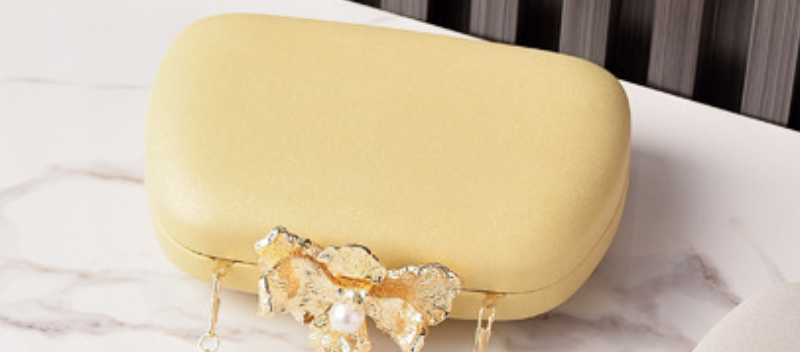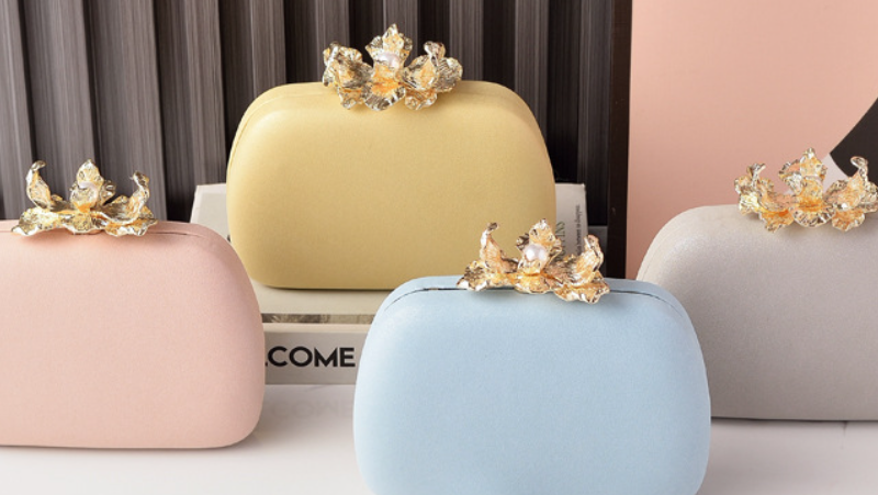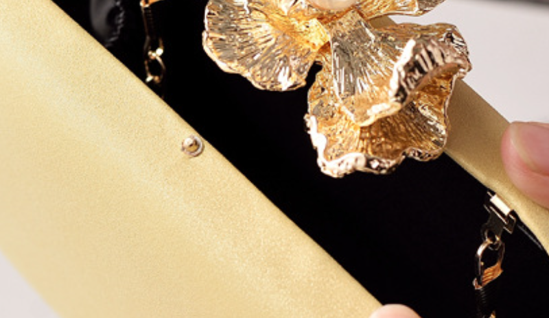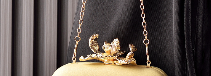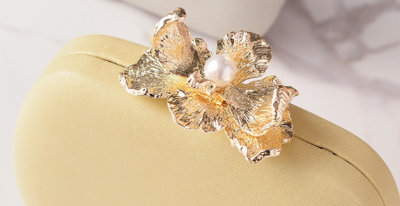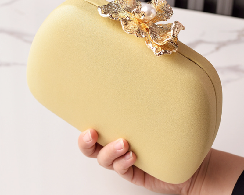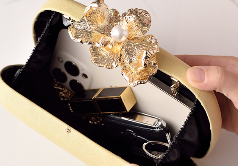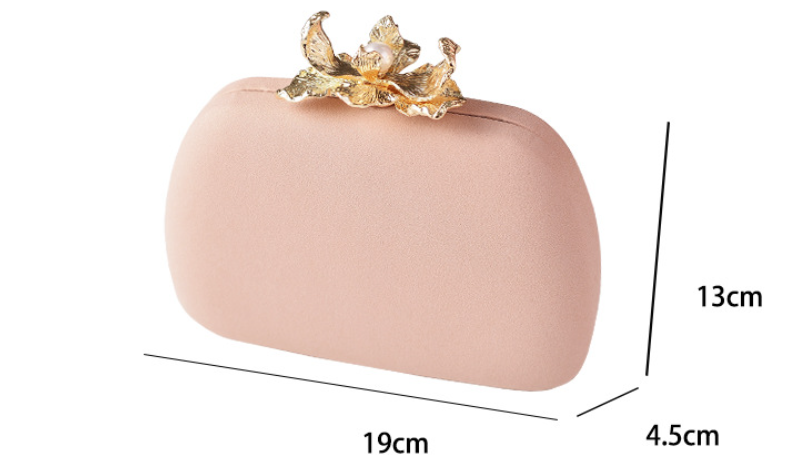 This exquisite clutch boasts a smooth, luxurious champagne-gold finish, providing a refined backdrop for its stunning focal point. It's adorned with a beautifully crafted metallic golden flower, delicately centered with a lustrous pearl, serving as both decoration and clasp. Perfect for weddings, formal dinners, or any special occasion, this bag adds a touch of timeless elegance and sophisticated artistry to your look.