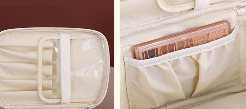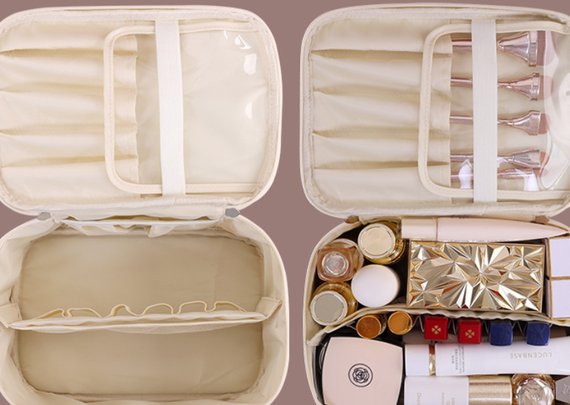 Streamline your beauty routine with our multi-functional cosmetic bag, engineered for customizable organization. Featuring smart, adjustable compartments and a transparent top section for brushes, it expertly stores all your essentials, big or small. Crafted from durable, easy-to-clean material, this versatile bag keeps your products secure and visible, eliminating clutter and saving you time. Ideal for both daily use and sophisticated travel, it's the ultimate solution for a perfectly ordered beauty collection.
