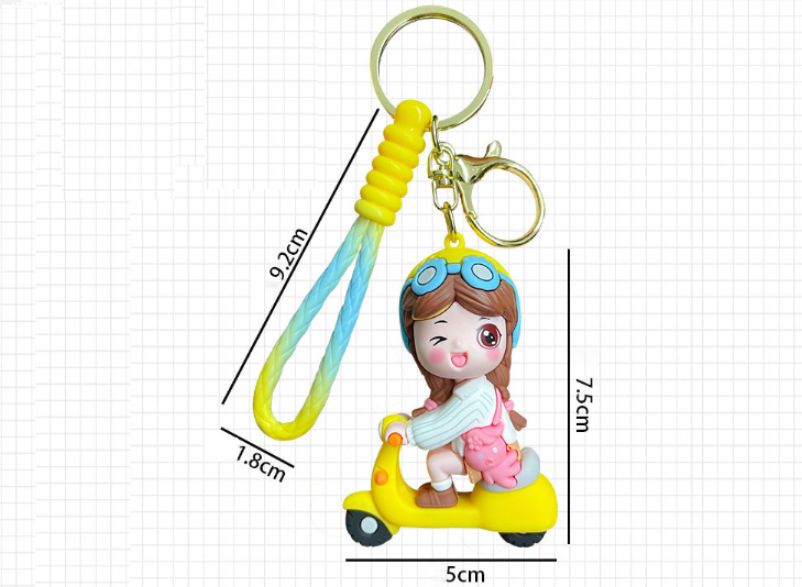 Hit the road in style with the Scooter Girl Epoxy Bag Charm, a fun and fashionable accessory that brings playful energy wherever you go. Featuring an adorable cartoon girl riding a bright yellow electric scooter with a pink buddy in her lap, this high-quality epoxy doll Bag Charm is perfect for adding charm to your keys, schoolbag, handbag, or even your car mirror.