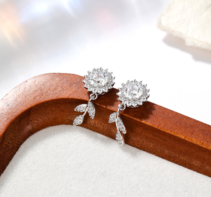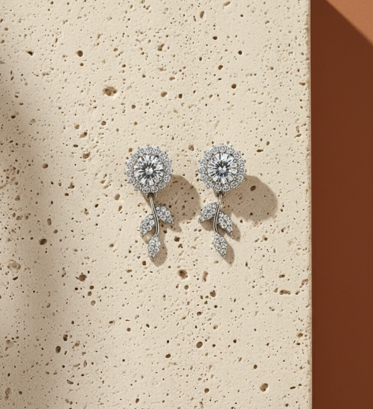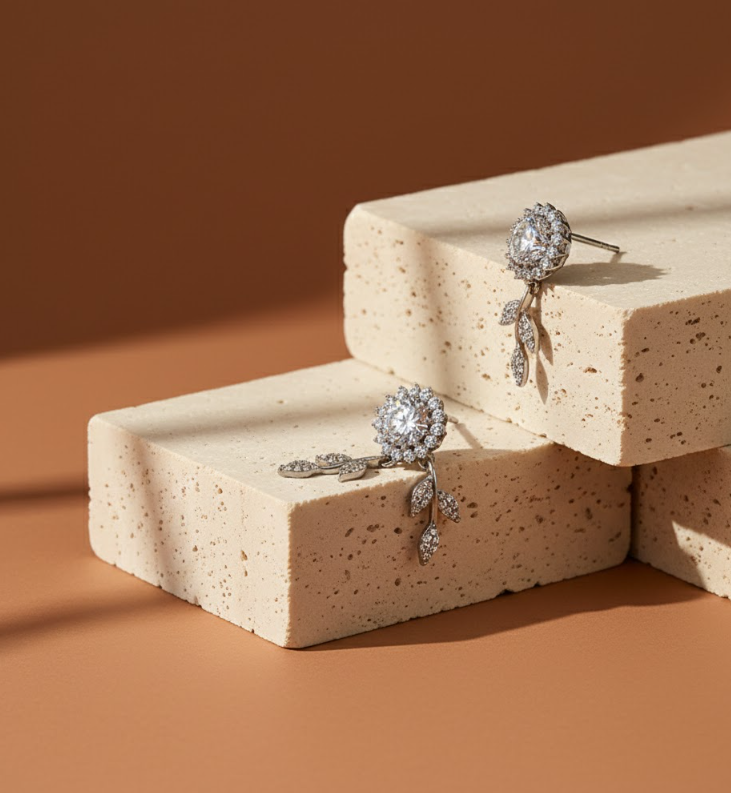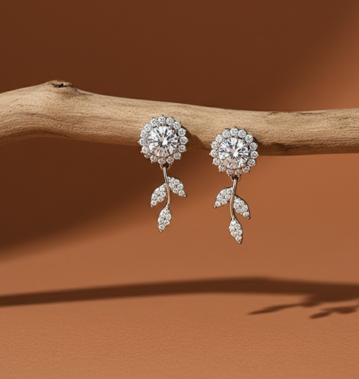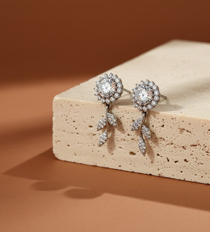 The Zircon Flower Long Earrings feature a three-dimensional flower design encrusted with sparkling cubic zirconia. Inspired by vintage elegance, these earrings offer a graceful and stylish look with a unique design touch.