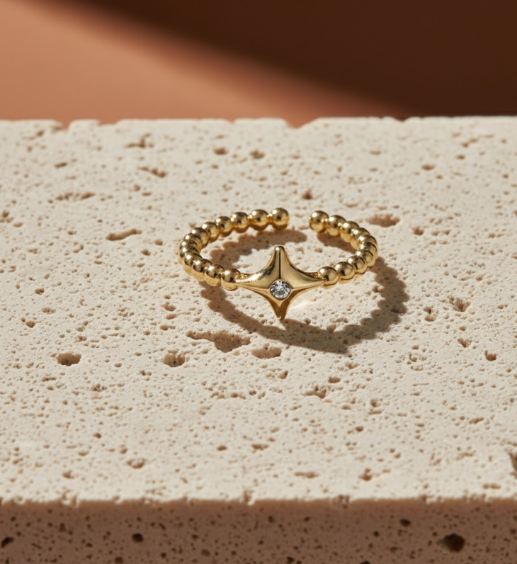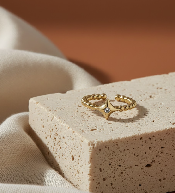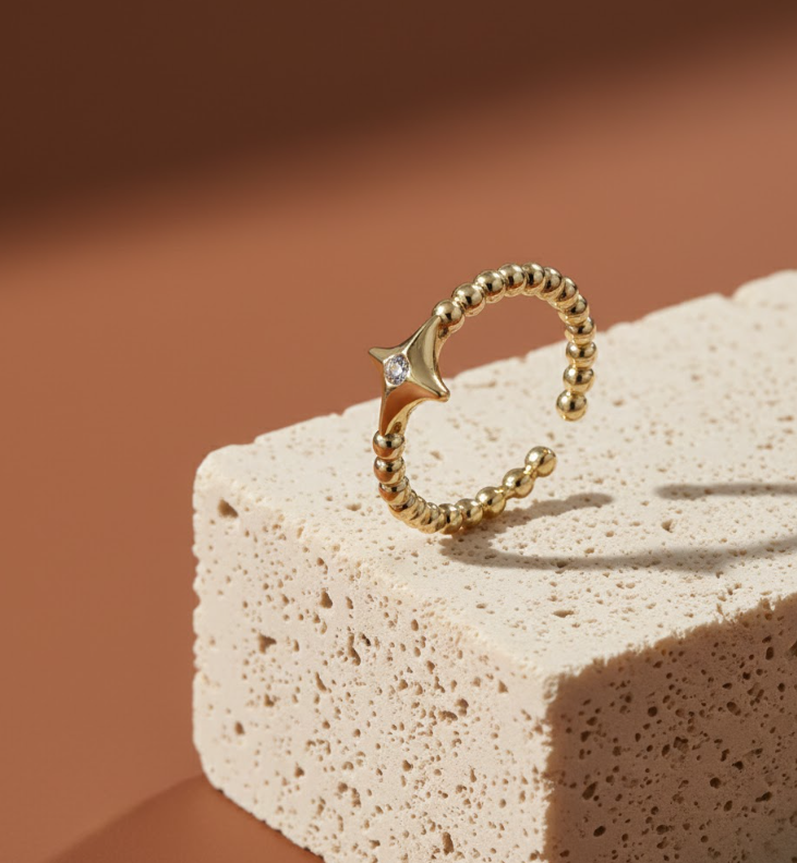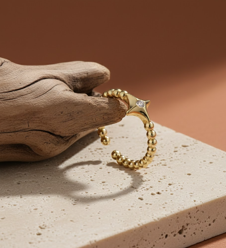 The Zircon Star Open Ring features a delicate star design inlaid with sparkling zircon stones, creating a simple yet high-end look. Its open-ring structure offers a comfortable and adjustable fit, making it suitable for everyday wear.